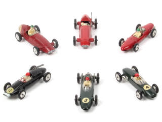 miniatures reproduisant les modèles : MASERATI (2 exemplaires), FERRARI, LOTUS, BRM & COOPER - quelques accessoires manquants & cassés - certaines sorties d'échappement ternies