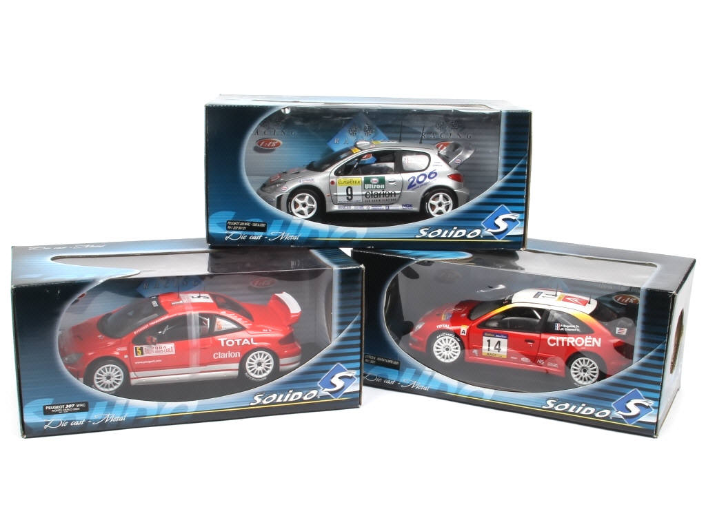 échelle 1/18ème - comprend : PEUGEOT 307 WRC MONTE CARLO 2004 (un rétroviseur à recoller), 206 WRC 1999/2000 & CITROEN XSARA T4 WRC-2001