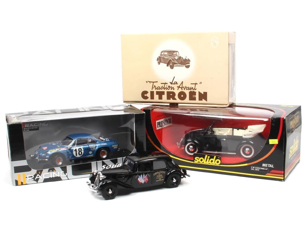 échelle 1/18ème - comprend : ALPINE A110 1800 rallye & VOLKSWAGEN COCCINELLE cabriolet - on y joint une CITROEN TRACTION 11 BL '50ème ANNIVERSAIRE DE LA LIBERATION DE PARIS' de la marque ELIGOR