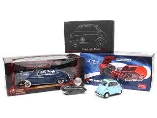 différentes échelles - comprend : BMW ISETTA '50ème anniversaire' (édition limitée à 500 pièces), MERCURY PARK LANE 1959 & CHRYSLER NEW YORKER (édition limitée) - on y retrouve les marques : SUN STAR, PREMIUM CLASSIXXS & SIGNATURE MODELS - quelques accrocs sur 2 suremballages