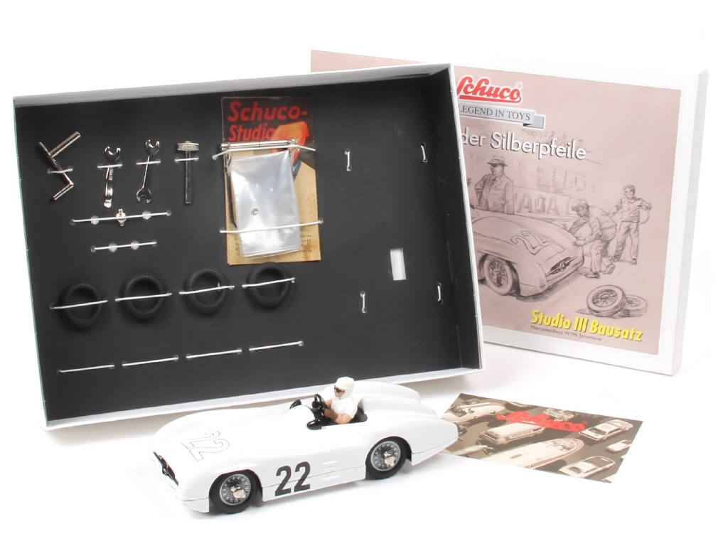 production récente - dimensions : 35 x 25 cm - véhicule à construire (déjà assemblé) - contient : une MERCEDES de course (moteur à clef fonctionne), différents éléments, figurine, accessoires, certificat d'édition limitée à 1000 exemplaires & notice (possibilité d'accessoires manquants) - avec mousse de protection & suremballage cartonné (état 'c')