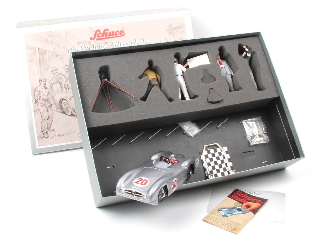 production récente - dimensions : 43 x 31 cm - véhicule à construire (déjà assemblé) - contient : une MERCEDES de course (moteur à clef fonctionne), différents éléments, figurines, accessoires, certificat d'édition limitée à 1000 exemplaires & notice (possibilité d'accessoires manquants) - avec mousse de protection & suremballage cartonné