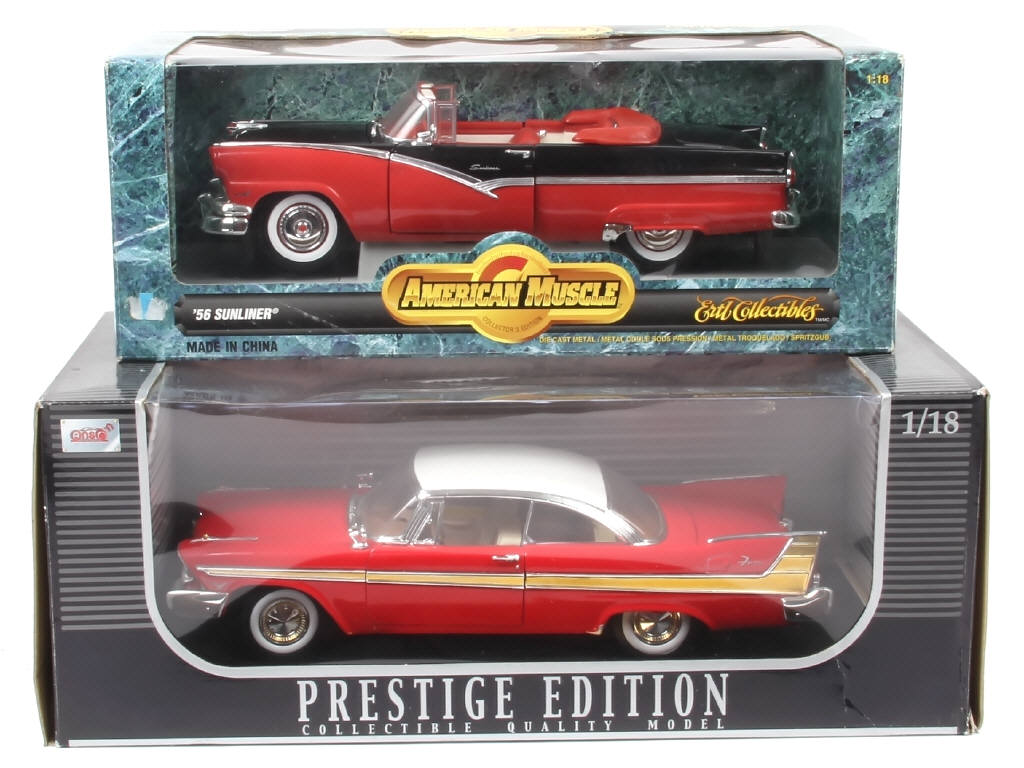 échelle 1/18ème - comprend les modèles : FORD SUNLINER 1956 & PLYMOUTH FURY 1957 - on y retrouve les marques : ERTL & ANSON - quelques petits accrocs sur les boîtes