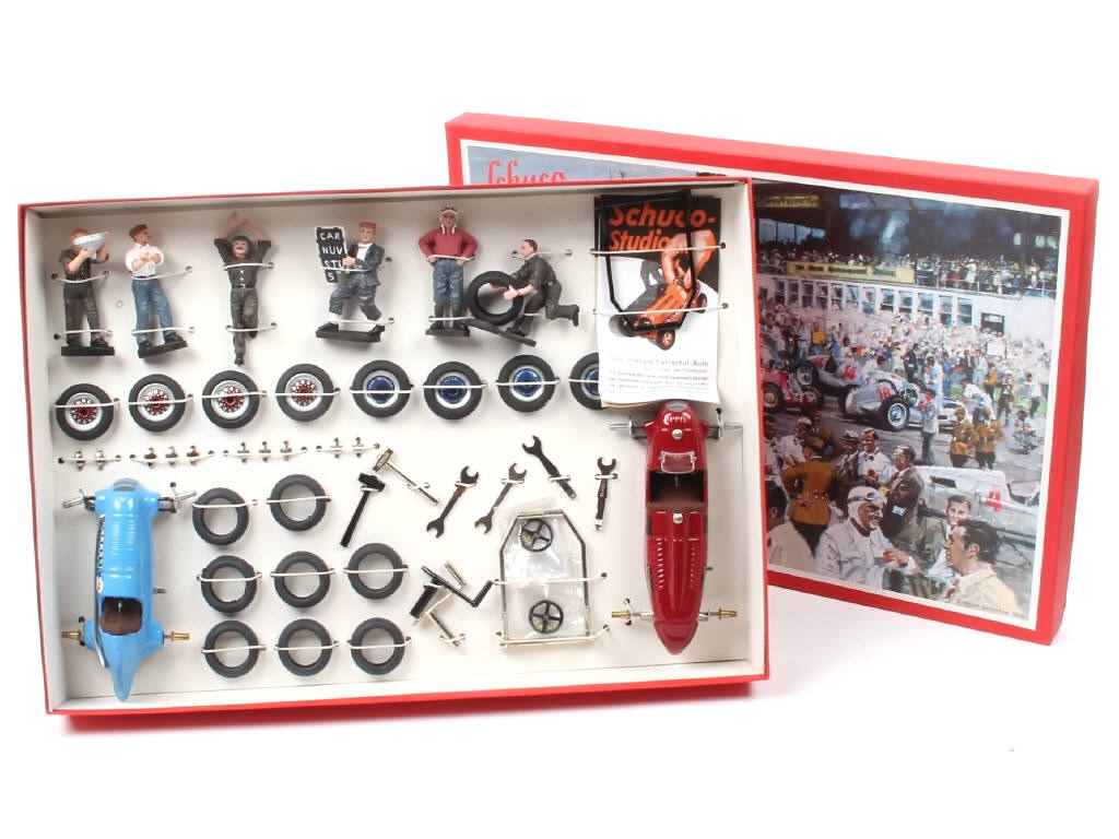 production récente - dimensions : 43 x 31 cm - véhicules à construire - contient : une MERCEDES, AUTO-UNION, différents éléments, accessoires (une trace d'oxydation sur une clef) & personnages (suremballage & notice présente) - sur planche de présentation avec élastique de maintien