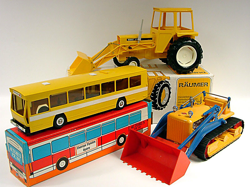 longueur 36,5 cm - moteur à piles (fonctionne) - en action, le bulldozer avance ou recule au moyen d'un levier tandis que le moteur s'éclaire - trappe du logement à piles cassée - traces de peinture sur le plancher