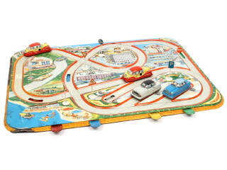 dimensions : 50 x 35 cm - avec 4 voitures (moteurs à clef - fonctionnent) & 6 panneaux de signalisation (petits manques & parties cassées) - petites traces d'oxydation