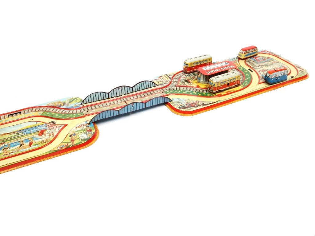 dimensions : 50X120 cm (déplié) - avec 2 autobus & 2 tramways - moteurs à clef (fonctionnent plus ou moins - à revoir) - 2 véhicules en état 'D' dont un non conforme - traces d'oxydation