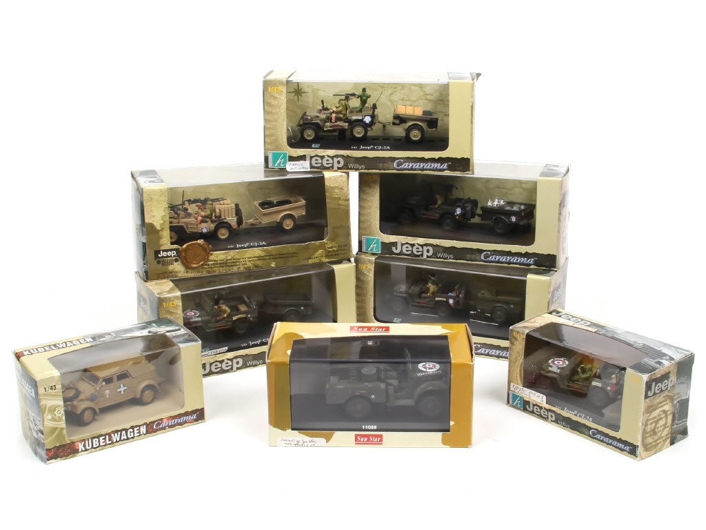 miniatures reproduisant notamment les modèles : JEEP & DODGE - on y retrouve les marques : CARARAMA & SUN STAR - quelques petites transformations & décalques ajoutés - quelques accrocs sur les boites