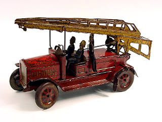 longueur 29 cm - moteur à ressort (fonctionne) - manque bruiteur & 2 pompiers - véhicule entièrement reverni - traces d'oxydation - un pompier à refixer