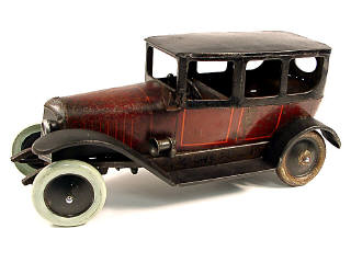 longueur 34 cm - moteur à clef (fonctionne) - avec direction par le volant - fabriquée de 1926 à 1933 - véhicule en grande partie restauré - manque le projecteur de la portière conducteur, le phare droit, l'ensemble aile avant-arrière & marchepied du côté passager & le bouchon de radiateur - 2 roues non d'origine