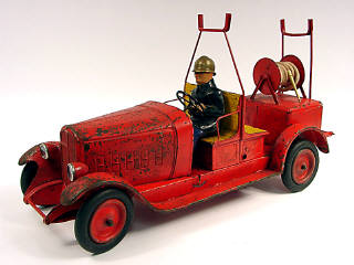 longueur 46 cm - moteur à clef (à revoir) - direction par le volant - avec un pompier - manque échelle double & dévidoir arrière - phares non d'origine - calandre repeinte & retouches de peinture
