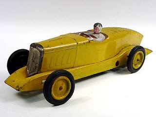 longueur 43,5 cm - moteur à clef (fonctionne) - avec direction - ce modèle surnommé 'ROSALIE V' comporte 5 ouïes de part et d'autre du capot moteur - tête du pilote restaurée