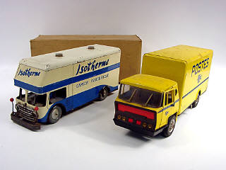 longueur 37 cm - moteur à clef (fonctionne) - avec essuie-glace fonctionnants avec les roues avants - manque une porte du fourgon - quelques traces d'oxydation