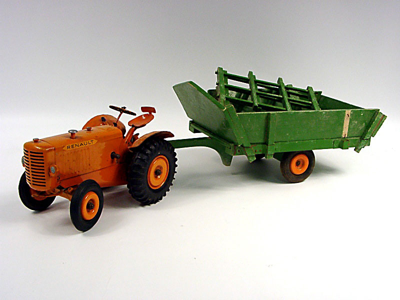 longueur de l'ensemble 50 cm - version mécanique de 1952, sans conducteur, avec décalques RENAULT sur le capot - moteur à clef (fonctionne) - train avant légèrement tordu - quelques retouches de peinture - ressort du siège conducteur non d'origine - 4 éléments supplémentaires sont fournis pour la transformation de la remorque - un petit manque sur la remorque