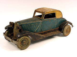 longueur 37,5 cm - moteur à ressort (à revoir) - manque ampoules de phares & roue de secours - traces d'oxydation