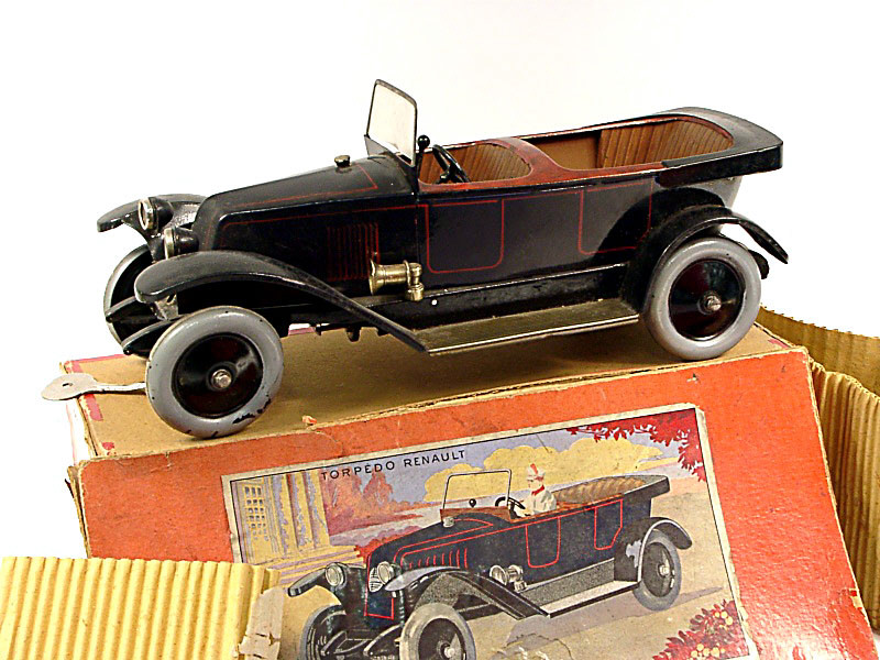 longueur 34 cm - moteur à clef (fonctionne) - direction par le volant - avec clef (non d'origine) - modèle produit entre 1925 & 1931 - 2 petites pattes de fixation de l'aile avant droite cassées & 2 traces de colle sur la pignonnerie arrière - avec cales de boîte - bandage anti-dérapant d'origine sur 2 roues présent - ETAT DE PRESENTATION & DE CONSERVATION REMARQUABLE POUR UN JOUET DE CETTE EPOQUE !