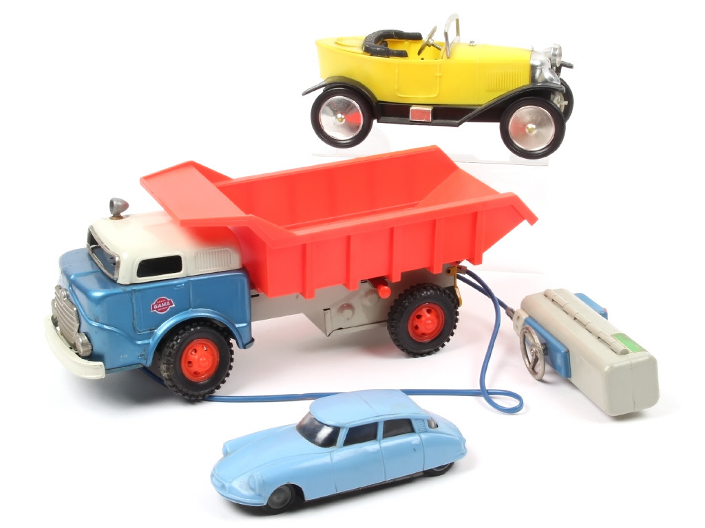 différentes grandes échelles - CITROËN DS en plastique de la marque LEMEZARU (moteur à friction poussif - jantes terines), camion-benne téléguidé GAMA (moteur à piles à revoir - quelques défomations) & CITROËN 5HP NACORAL (un phare cassé, à recoller) - quelques traces d'oxydation & frottements par endroits