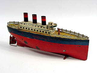 DIVERS Petit paquebot en tôle peinte à 3 cheminées rouge & bleu