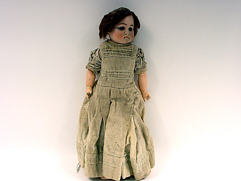 hauteur 42 cm - tête en biscuit marquée en creux '1900-3/0 made in Germany' - yeux fixes bleus - bouche ouverte sur une rangée de dents - corps en composition articulé - perruque châtain (en état 'F') - cheveux naturels - 2 jupons & une robe sans manche - manque l'index de la main droite & une partie du pouce