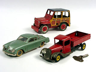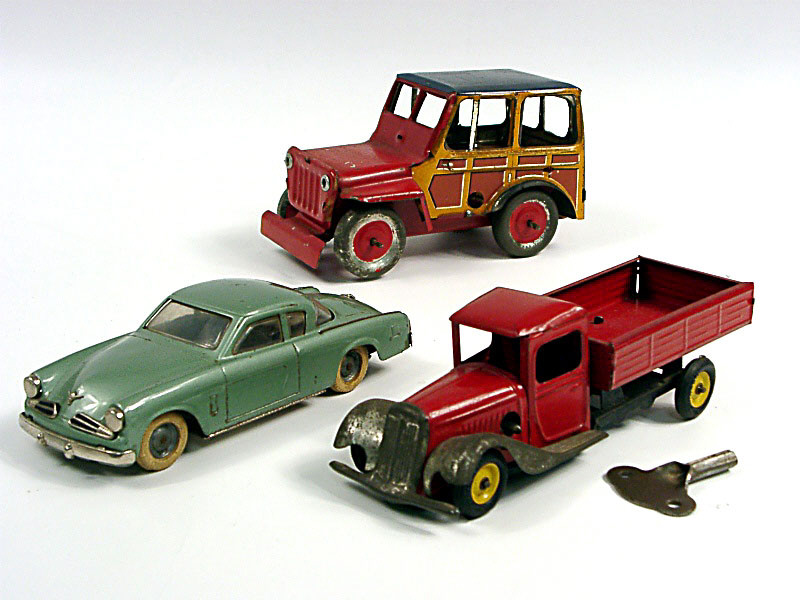 longueur 15 cm - moteur à clef (fonctionne) - avec clef - parties nickelées ternies - avec petite étiquette de prix de l'époque