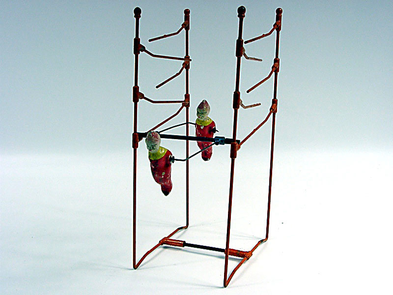 hauteur 26 cm - personnages en composition - barre stabilisatrice & portique en métal - en action, les 2 personnages animés par la force gravitationnelle descendent jusqu'au bas du portique - les figurines tournent autour d'une barre transversale qui roule sur chacun des étages - fabrication vers 1908 - quelques traces d'oxydation sur la barre de maintien du portique - ce jouet est aussi connu sous le nom 'LES VOLTIGEURS' avec des personnages en tôle peinte