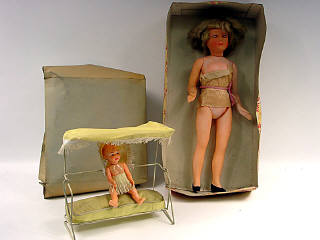 hauteur 14,5 cm - articulé - yeux mobiles bleus - avec chapeau de paille & pagne - tissu jaune du canapé avec salissures - avec cales de boîte - manque couvercle de boîte