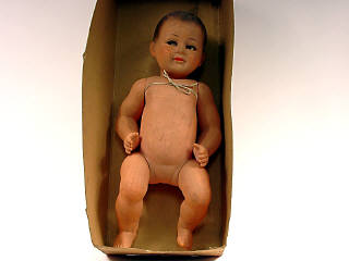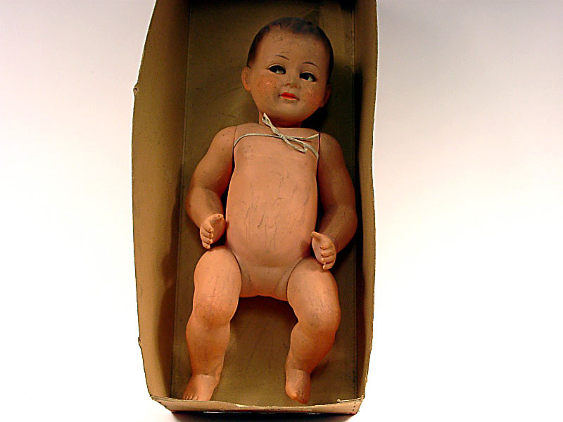 hauteur 53 cm - articulé - yeux bleus mobiles (à revoir) - avec petite étiquette au poignet marquée 'NOBEL' - manque couvercle de boîte