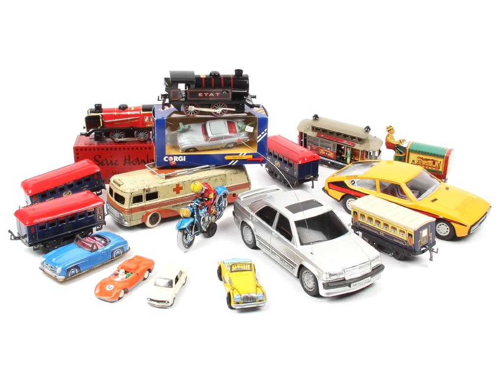 on y retrouve notamment les marques : JOUSTRA, PAYA (reproduction), EDITIONS HACHETTE (reproduction HORNBY), CORGI TOYS, SOLIDO & CLE - avec manques, parties cassées, oxydées & remplacées sur certains exemplaires
