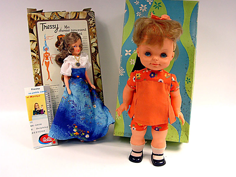 hauteur 36,5 cm - yeux mobiles - avec robe & short orange - cheveux blonds - la boîte fait office de présentoir