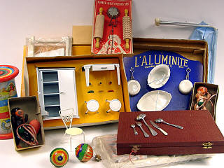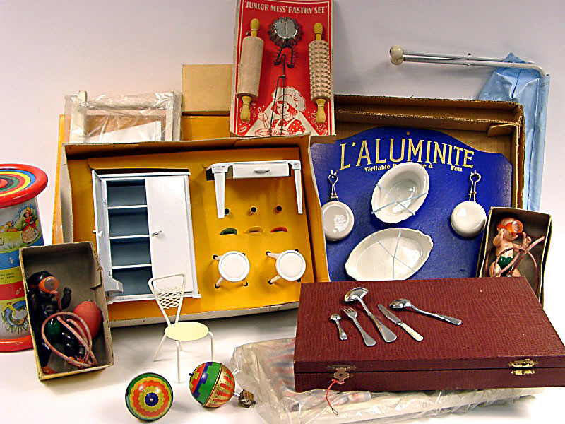 comprend : un fauteuil en tôle, 2 toupies en tôle lithographiée, un ensemble de rouleaux à pâtisserie, 2 fauteuils transat, un rouleau à pousser avec bruiteur, une ménagère, 2 petits bébés 'grenouille' en celluloïd, un ensemble d'éléments de vaisselle en porcelaine, un plan à langer & un ensemble d'éléments de cuisine en tôle peinte - tous ces jouets proviennent d'un fond de magasin