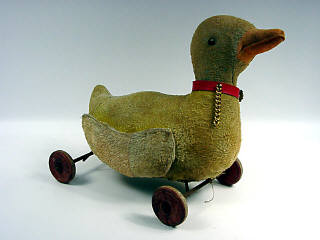 longueur 36 cm - bourrage en paille -yeux en boutons de bottines - parties de tissu élimées - châssis en métal & roues en bois - fabrication des années 30 - 4 ficelles d'attache de châssis non d'origine