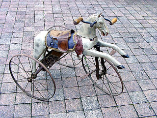 longueur 75 cm - en bois & métal - transmission par chaîne aux roues arrière grâce à 2 manivelles situées de part & d'autre de la tête du cheval - la direction s'effectue par les pieds - quelques manques - tissu & cuir de la selle très défraîchis - TRES BELLE FABRICATION DE LA FIN DU XIXème SIECLE !