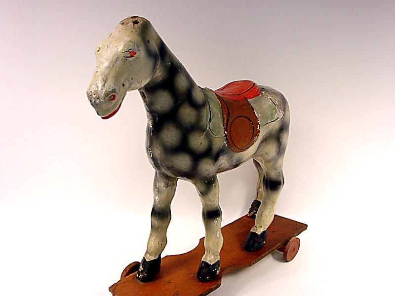 dimensions : 48 x 16 x 51 cm - en carton bouilli & bois - manque oreilles, crinière, rênes & roulette arrière droite