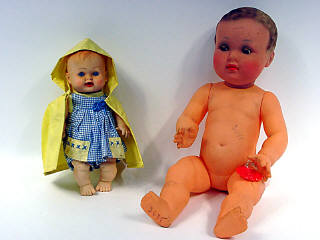 hauteur 24,5 cm - tête articulée - yeux bleus - bouche comportant un orifice pour un biberon - avec bruiteur (à revoir), short, robe bleue & ciré jaune