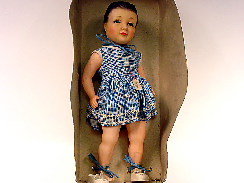 hauteur 43 cm - articulée - yeux bleus - cheveux moulés bruns avec chignon - manque couvercle de boîte