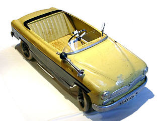 longueur 130 cm - avec trompe sonore, plaque minéralogique, rétroviseur, pare-brise & compteur (non d'origine) - manque un feu arrière - retouches - doute sur l'authenticité de la peinture des flancs