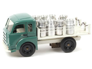 longueur 31,5 cm - version avec portières ouvrantes - avec moteur à clef (fonctionne), direction & 8 bidons de laits (dont 4 non d'origine & un autre non conforme) - BELLE RESTAURATION !