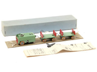 contient : un chariot mécanique (moteur à clef fonctionne), 2 wagonnets, clef, notice & cale de boîte avec ficelles de maintien d'origine (coupées) - pneus jaunis & séchés - quelques éléments plus ou moins ternis - boîte plus ou moins décolorée avec quelques petites taches
