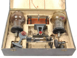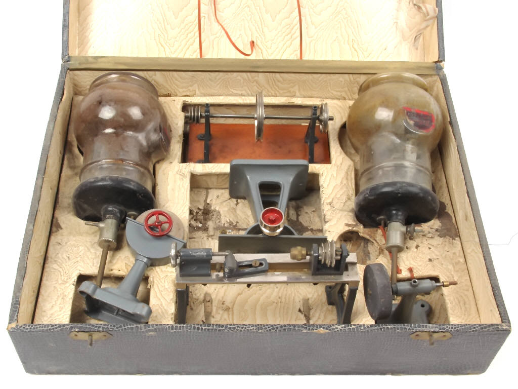 non testé - dimensions : 38 x 29 cm - contient 5 machines-outils & 2 bocaux à électrolyse - avec parties oxydées, cassées, manquantes & traces de métal fatigue