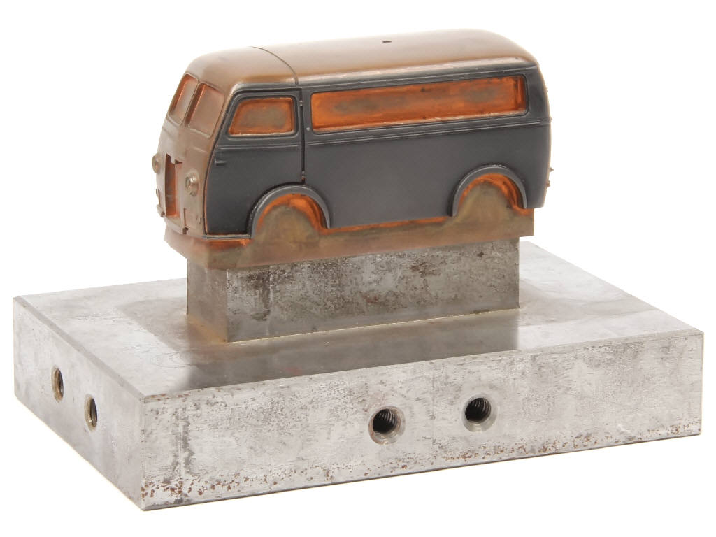 ce type de pièce d'usinage a remplacé l'utilisation du maitre-modèle à l'usine SOLIDO avec l'arrivée de la machine à électroérosion - cette pièce unique très lourde, réalisée en cuivre et métal permettait la fabrication définitive du moule - nous avons probablement ici une des rares pièces (voire la seule de ce type) survivantes après la fermeture de l'usine, où elle a été récupérée directement - HISTORIQUE !