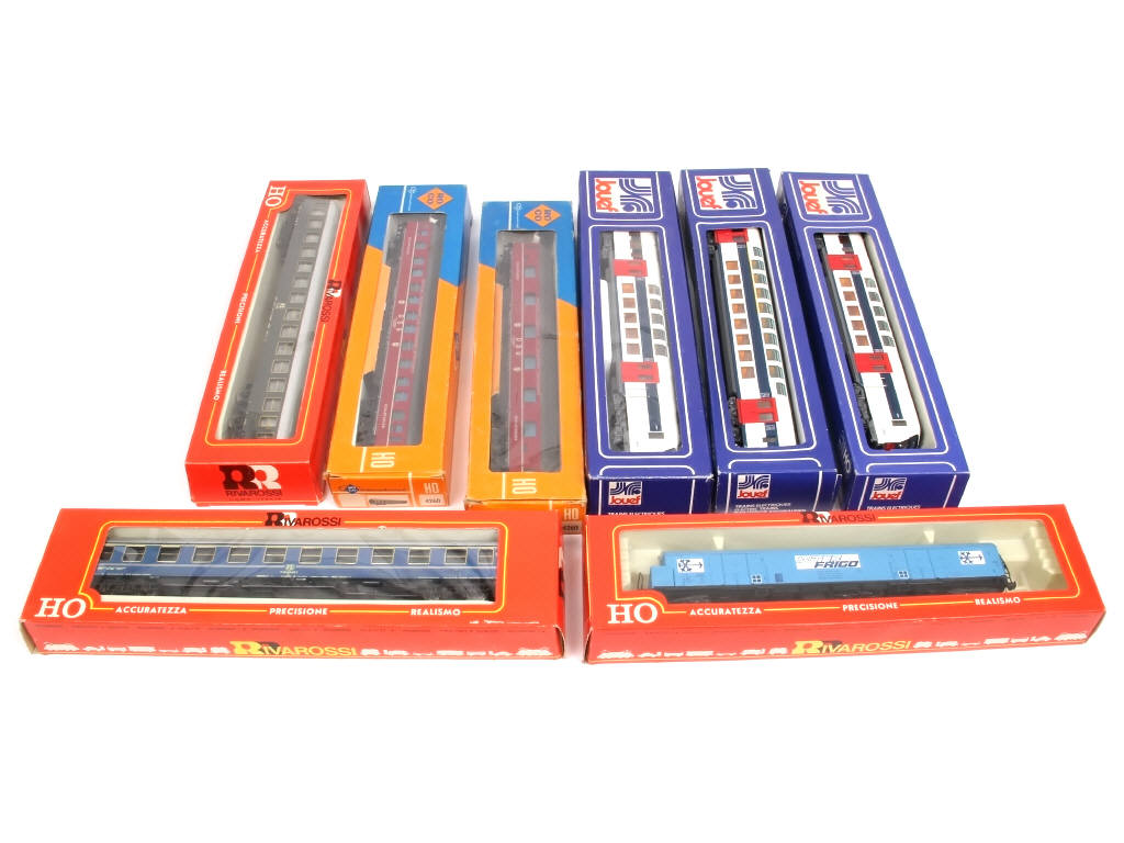 comprend les références : 4260 (2 exemplaires), 2431, 2530, 2589, 5093, 5191 & 8730 - on y retrouve les marques : ROCO, RIVAROSSI & JOUEF - quelques boites en état 'c' (manque 2 blisters)
