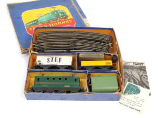 états de 'A' à 'C' - coffret taché par endroits (avec cales) - non testé - contient : motrice électrique BB-8051 (avec étiquette 'GRAISSAGE OBLIGATOIRE'), wagon bâché 'SAINT-FRERES' (sans bâche), wagon frigorifique 'STEF', transformateur, 12 rails courbes & 2 rails droits (éléments plus ou moins ternis & oxydés), un flacon d'huile, une boite d'accessoires & 2 notices