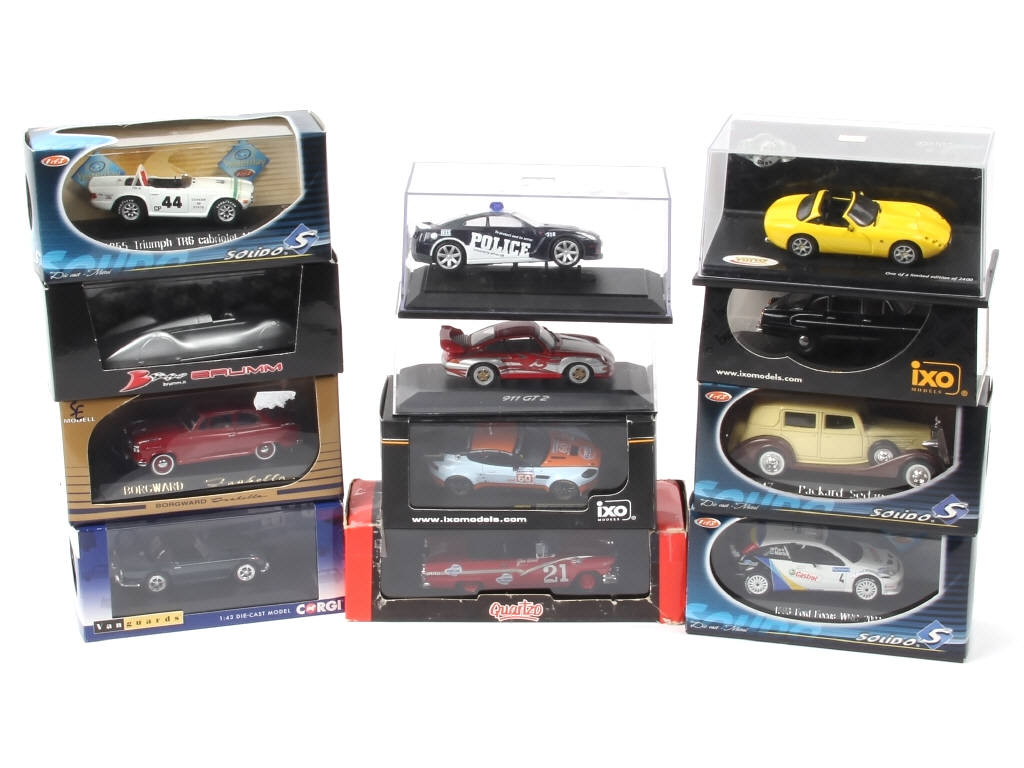 miniatures reproduisant notamment les modèles : ASTON MARTIN, PACKARD, FORD & TRIUMPH - on y retrouve notamment les marques : SOLIDO, CORGI TOYS & IXO - quelques boîtes en état 'c' - possibilité de petits accessoires manquants