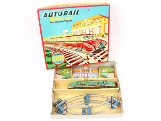contient : autorail à un élément 'PARIS-LYON MARSEILLE-NICE' (moteur à clef fonctionne), façade de gare, tunnel & 4 rails courbes (sans autre accessoire, manques signaux) - calage de boîte & clef présents - parties chromées très légèrement ternies - couvercle de boîte restauré