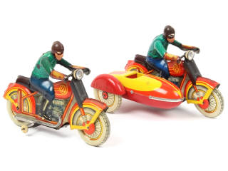 longueur 22 cm - moteurs à clef (fonctionnent) - un exemplaire avec side-car - quelques parties chromées plus ou moins ternies - retouches d'usine par endroits