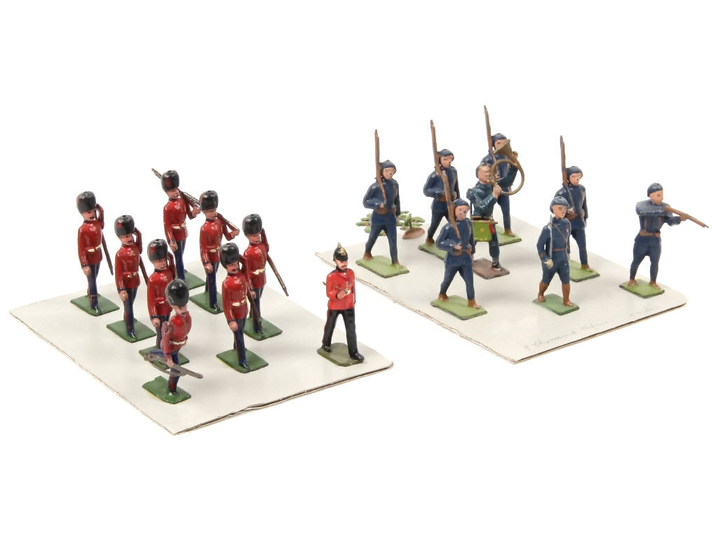 ensemble collé sur 2 cartons (un exemplaire décollé & un arbuste cassé) - comprend : 8 chasseurs alpins & 9 soldats britanniques - on y retrouve notamment la marque BRITAINS