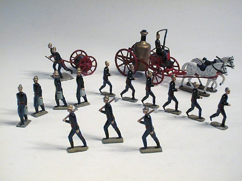 comprend 1 pompe à vapeur hippomobile avec conducteur, 1 dévidoir à bras avec ses 2 pompiers, 3 sapeurs avec hache, 4 porteurs d'eau & 6 pompiers - série demi-ronde bosse 4mm - ETAT SUPERBE !
