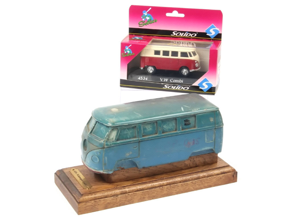 longueur 18,5 cm - réalisation en résine & bois, présenté sur socle en chêne massif - importants frottements avec quelques petits manques de matière sur la carrosserie par endroits - les maîtres modèles servaient à la fabrication des moules, il étaient fait en résine, bois, aluminium ou plâtre à une échelle double ou triple du futur modèle - pièce récupérée lors de la fermeture de l'usine - MODELE UNIQUE ! - on y joint la véritable miniature issue de cette étude (état 'A+.a')