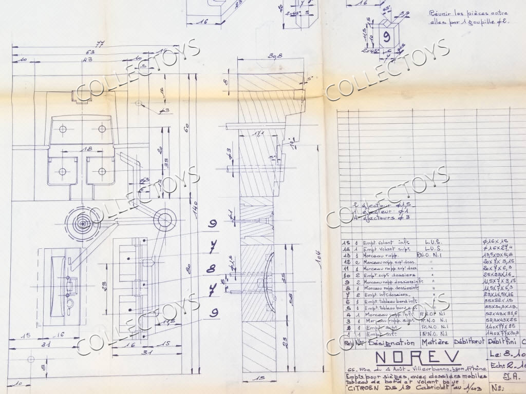 plan original avec dimensions provenant des archives du service communication de l'ancienne usine NOREV - dimensions : 104 x 90 cm environ - réalisé par le bureau d'étude de la marque le 8 octobre 1965 - il représente les différentes coupes du moule de la DS CABRIOLET - ce superbe témoin de l'histoire de la marque est l'un des plans rescapés avant la destruction totale des bâtiments - ce plan a un réel aspect esthétique, joliment encadré, il peut être un superbe objet de décoration - la photo ne représente qu'une partie du plan - celui-ci n'a jamais été copié ou diffusé dans son intégralité par COLLECTOYS ou son actuel propriétaire afin d'en préserver l'exclusivité pour son futur propriétaire - une déchirure de 8 cm