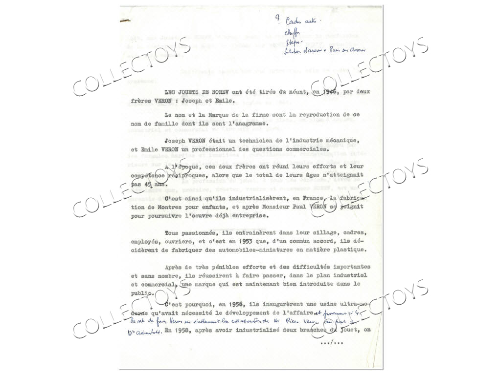 cette lettre dactylographiée de 2 pages reprend l'historique de la marque NOREV - elle est annotée d'époque (par Véron ?) - nous ne savons pas à quoi elle était destinée, probablement la presse locale et nationale - elle provient du service communication du l'usine - froissée